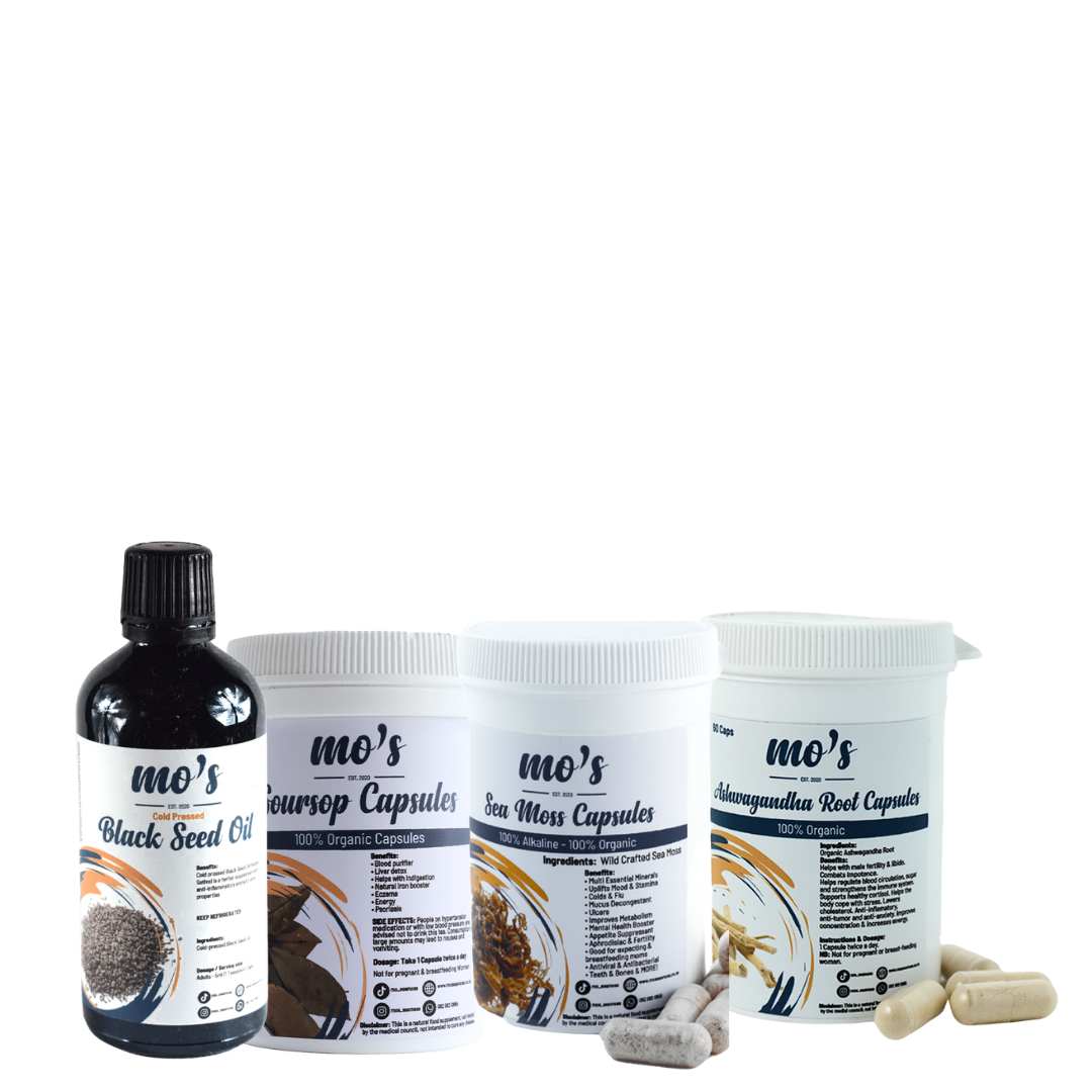 Mo's Seamoss Colon Cleanser, Black Seed Oil, Soursop Leaves Capsules, Seamoss Capsules, and Ashwagandha Capsules are carefully prepared for quality and purity. These natural, plant-based supplements support overall wellness, digestion, and daily health routines
